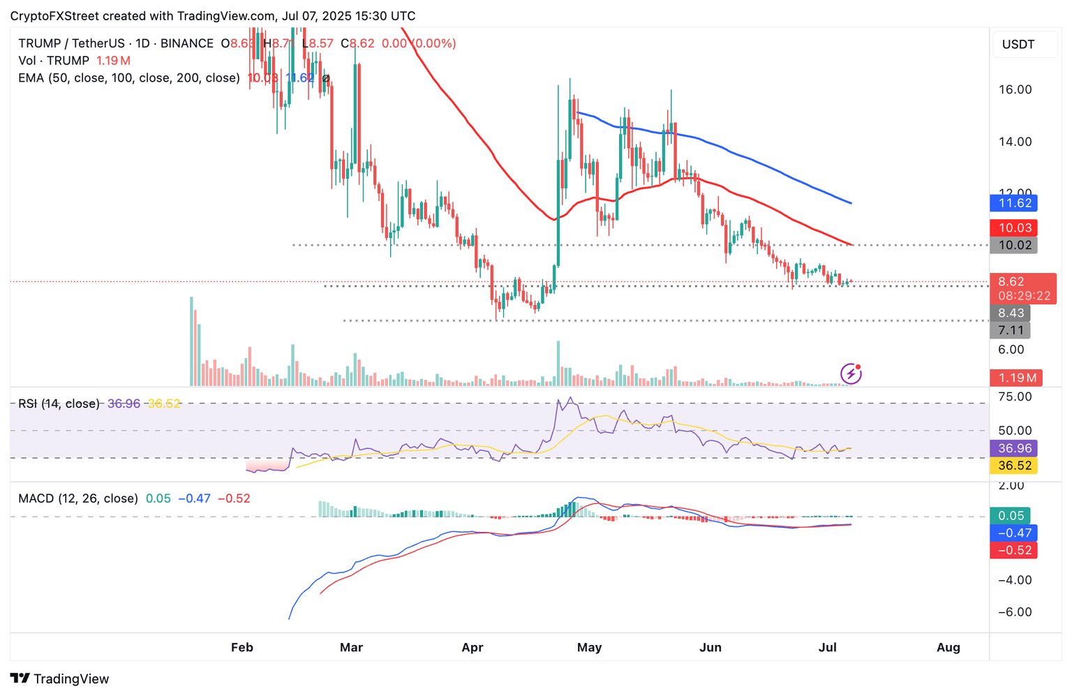 Official Trump (TRUMP) meme coin is trading at around $8.62, slightly above the $8.43 support level. The token launched days before United States (US) President Donald Trump’s inauguration in January, shows signals of broad consolidation ahead of a potential technical breakout past resistance at $10.00.