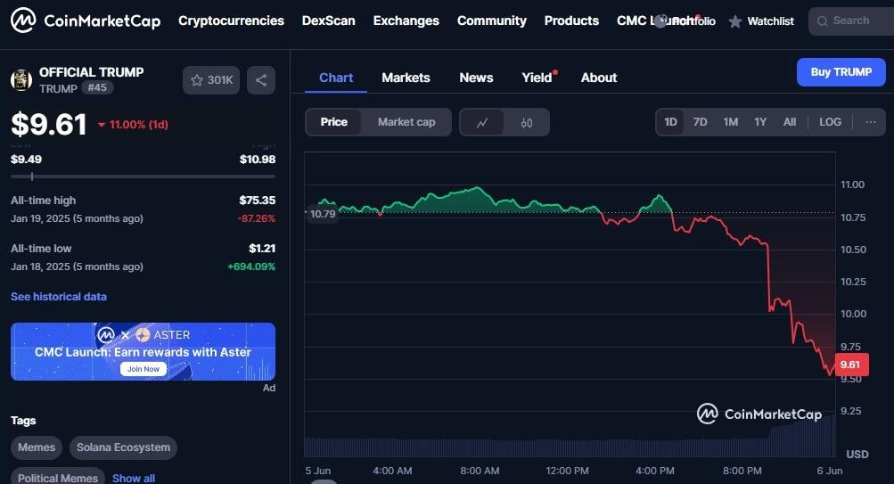 As Musk faces growing pressure—ranging from serious allegations, impeachment calls, and his potential plans for a new political party—the TRUMP token plummeted 11% in just a few hours, dropping to $9.59.