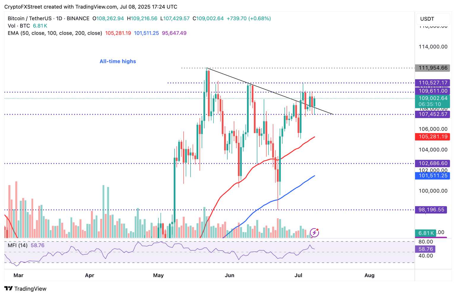 Bitcoin's price is extending intraday gains, printing a green candle and trading at $108,712 at the time of writing. The price remains above a recently broken descending trendline, which has been in place since Bitcoin reached its all-time high of $111,954 on May 22.