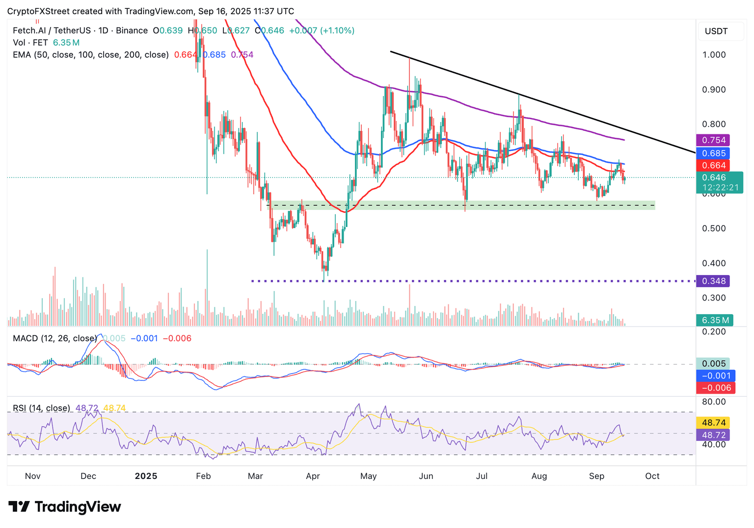 FET must reclaim its position above the 50-day and 100-day EMAs to validate its potential for recovery. Some of the key short-term targets include a break above the 200-day EMA at $0.75 and the descending trendline resistance, both of which could drive the next bullish phase toward the $1.00 level.