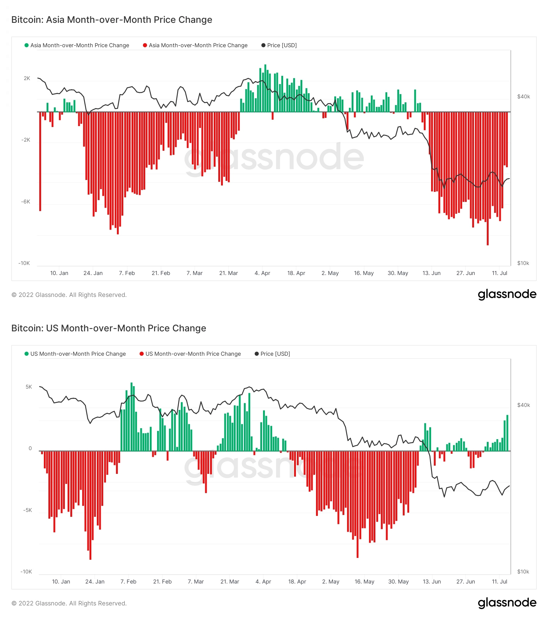 In particular, Bitcoin's month-to-month price change, which tracks the 30-day change in the regional BTC price, has been positive only during U.S. sessions. Conversely, the metric has only been negative during Asian trading hours, data from Glassnode shows.