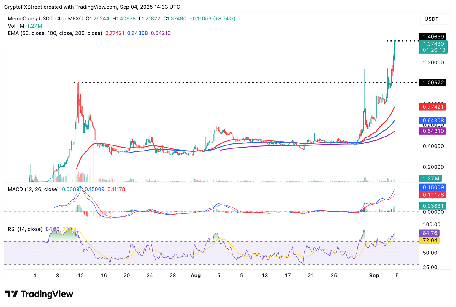 MemeCore is among the best-performing cryptocurrencies on Thursday, up over 38% to exchange hands at $1.37. Interest in the token began in late August after it struck a local bottom at around $0.36.