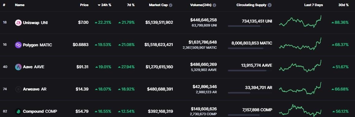 According to data from Cointelegraph Markets Pro and TradingView, the biggest gainers over the past 24-hours were Uniswap (UNI), Polygon (MATIC) and Aave (AAVE).