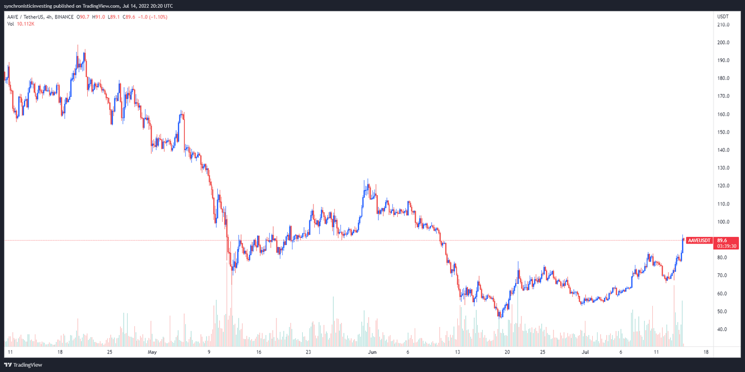 Data from Cointelegraph Markets Pro and TradingView shows that over the past 24-hours, the price of AAVE has rallied 38.5% from a low of $67.10 to hit a daily high of $93 in the afternoon hours on July 14.