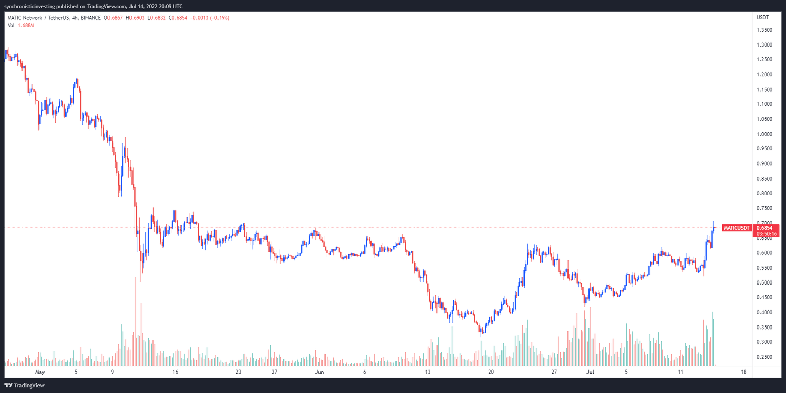 Data from Cointelegraph Markets Pro and TradingView shows that after briefly dipping to a low of $0.52 on July 13, the price of MATIC spiked 36% to hit a daily high at $0.707 on July 14 on the back of a 120% spike in its 24-hour trading volume.