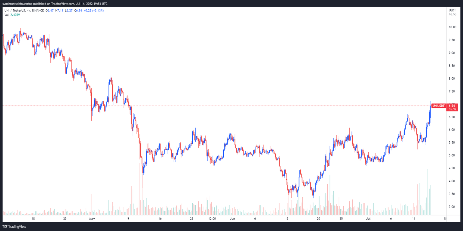 Uniswap, the top decentralized exchange by volume, saw its token price head higher on July 13 after hitting a low of $5.23. The token has since climbed 36% to hit a daily high of $7.11 on July 14 amid a 104% spike in its 24-hour trading volume to $449 million.