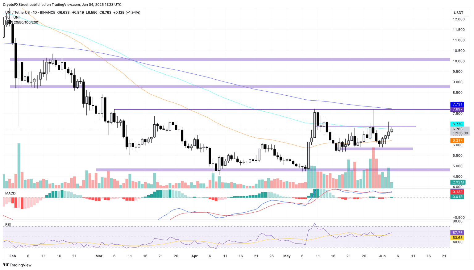 At the time of writing, Uniswap trades at $6.76, challenging the 100-day Exponential Moving Average (EMA) at $6.77. Investors could find a decisive daily closing above $6.88 as an entry opportunity, with the next resistance at the 200-day EMA at $7.69.