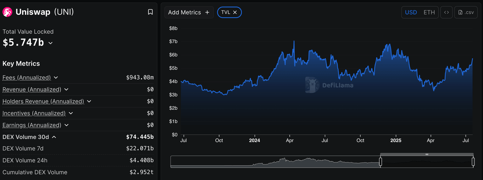 According to DefiLlama, the UNI’s Total Value Locked (TVL), which represents the value of all coins locked in smart contracts across all protocols on the chain, stands at $5.75 billion.