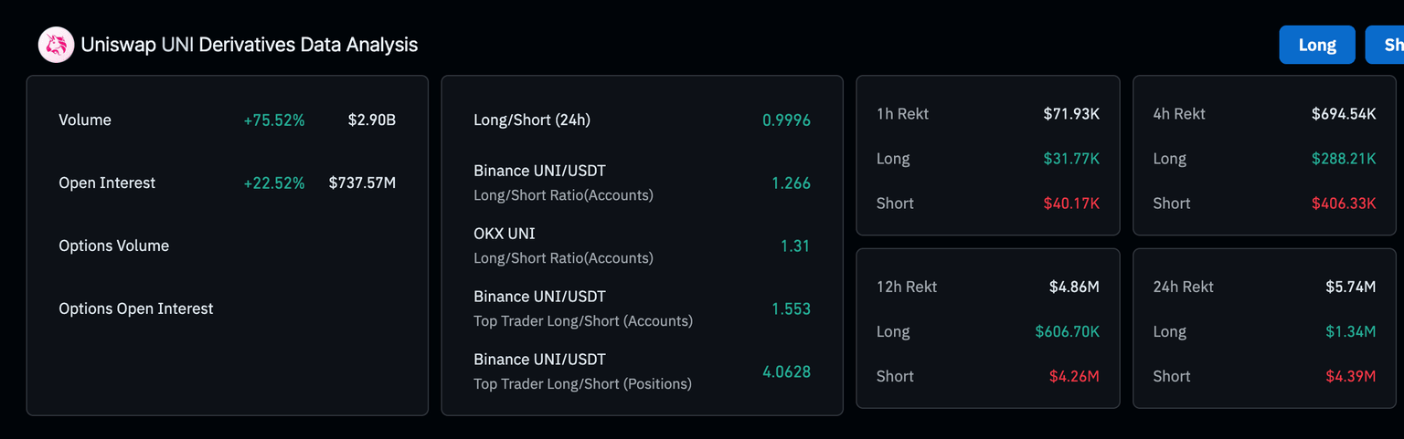 Interest in UNI is also reflected in the macro environment, particularly with the surge in the derivatives market Open Interest (OI) and volume. CoinGlass data shows that Open Interest, which refers to the value of all futures and options contracts that have not been settled or closed, increased nearly 23% to $738 million over the past 24 hours. With the volume rising 75% to $2.9 billion over the same period, it indicates that traders are willing to bet on future price increases.