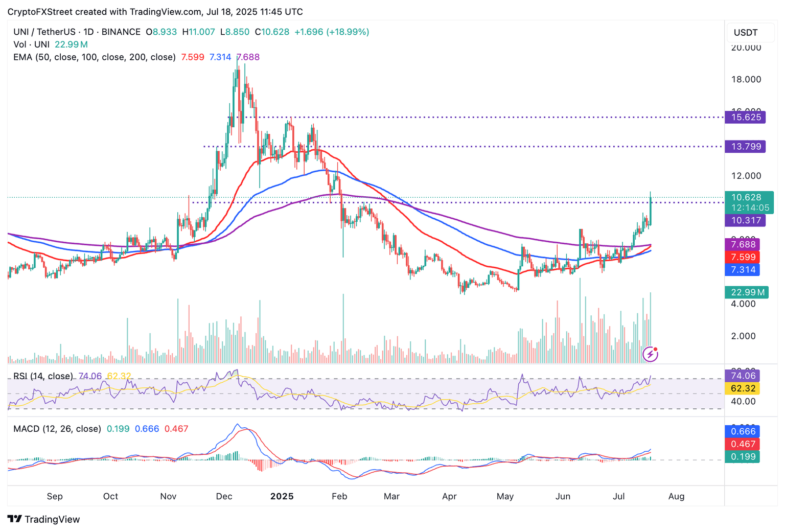 Uniswap (UNI) rallies, extending gains by nearly 20% to trade at around $10.62 at the time of writing on Friday. The surge in price of the Decentralized Exchange (DEX) native token underscores the growing investor interest in Decentralized Finance (DeFi) services and positive market sentiment, following the passage of three crypto regulation bills in the United States (US) House of Representatives.