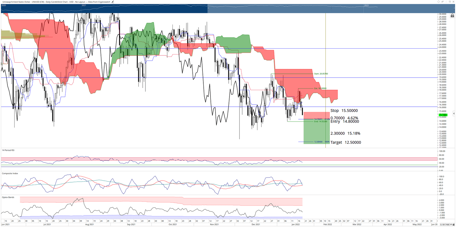There is an entry opportunity on the short side of the market on the daily Ichimoku chart. A close at or slightly below the 61.8% Fibonacci expansion at $14.78 would position Uniswap price at the lowest close since December 19, 2021. The profit target would be slightly below the 100% Fibonacci expansion level at $12.50. The stop loss is at $15.50. The trade represents a 3.3:1 reward/risk setup with an implied profit target of 15% from the entry.