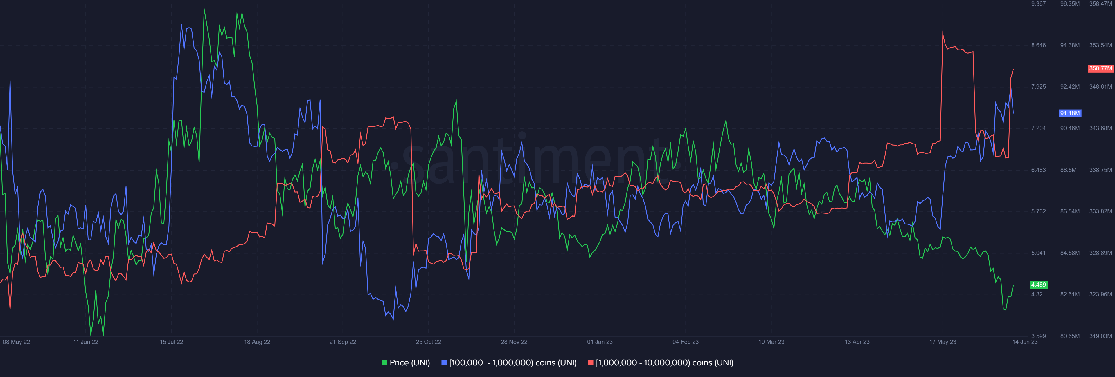 The biggest contributors to this buying were large wallet holders who have been adding more UNI to their balances. Cohorts holding between 100,000 to 1 million UNI tokens, along with the addresses holding 1 million to 10 million UNI, have amassed close to 11 million UNI worth nearly $50 million.