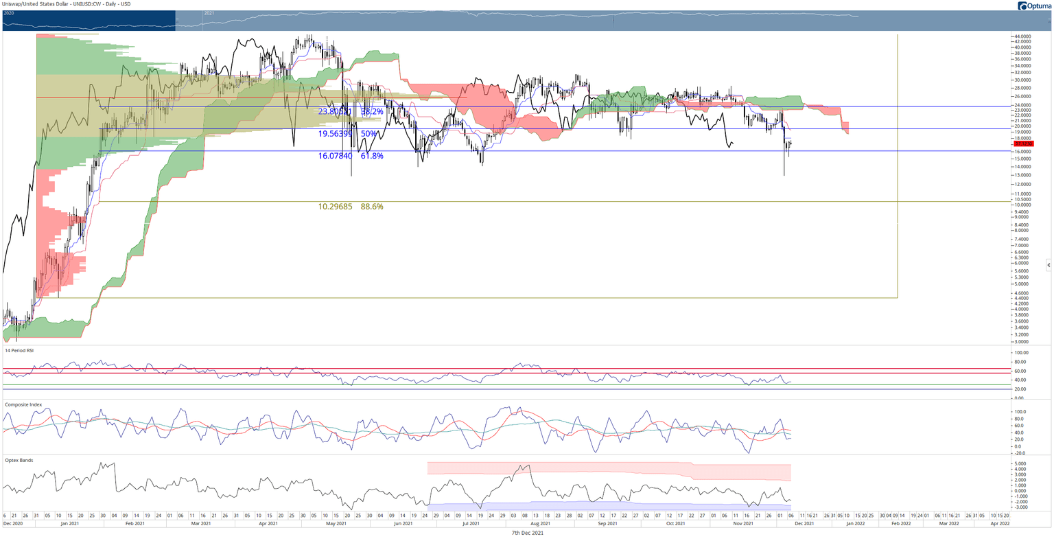 Bulls could quickly invalidate any near-term bearish sentiment and bias by rallying Uniswap price to a close above the Kijun-Sen and 50% Fibonacci retracement at $19.75.