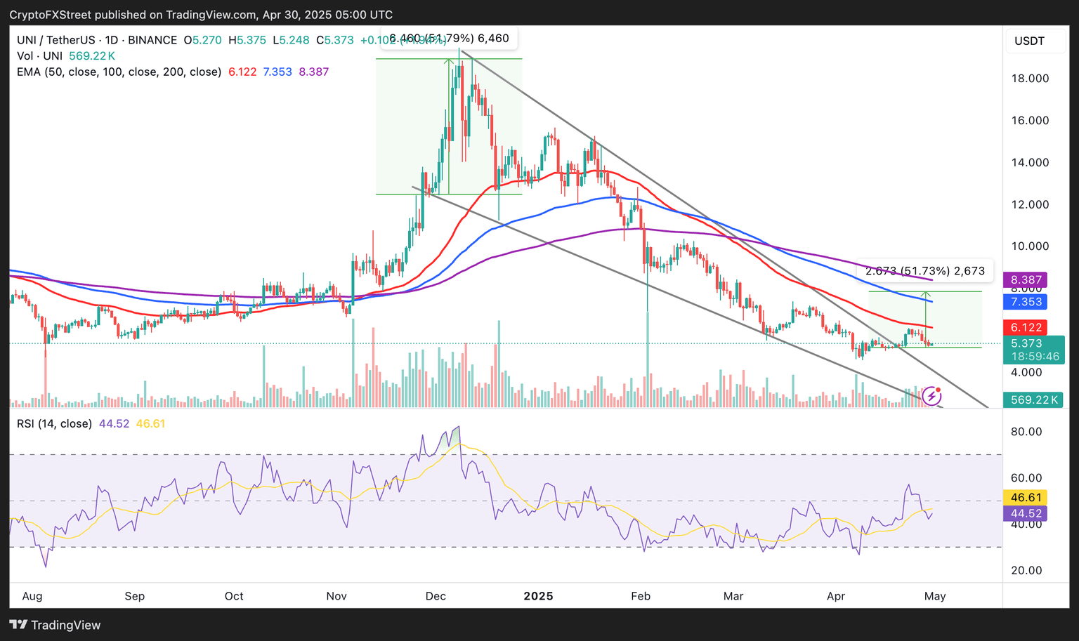 Uniswap broke above the upper trendline on April 20, accompanied by a spike in trading volume. However, UNI was rejected at $6.00, close to the 50-day EMA, leading to a minor reversal.
