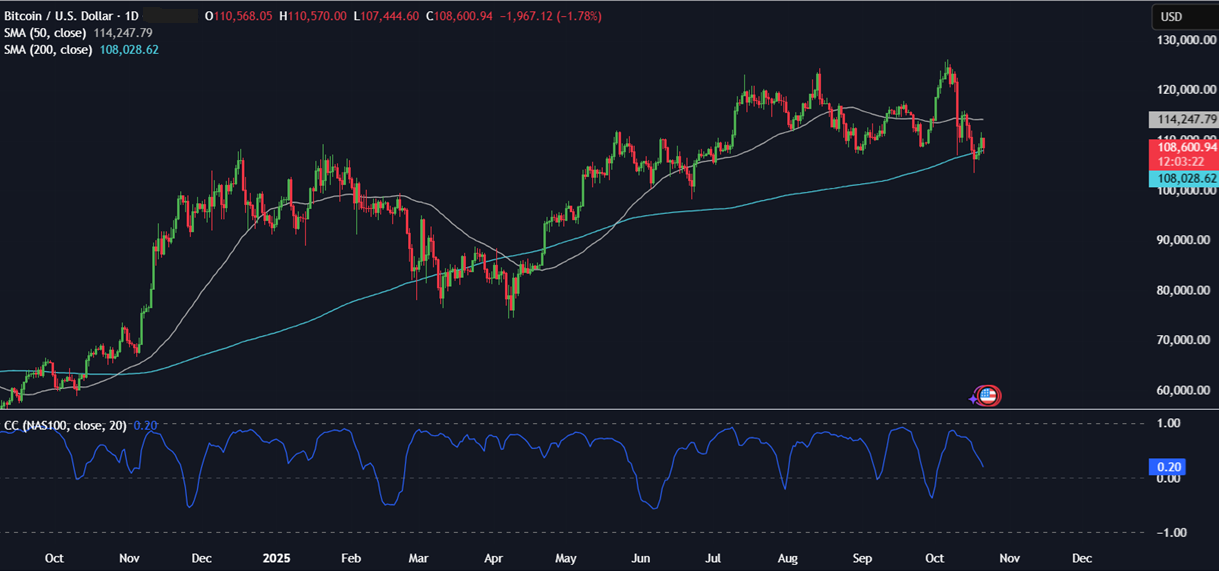 Highlighting the diverging correlation, Bitcoin is falling even as broader risk sentiment has improved due to Japanese political developments and easing US-China trade concerns. The US government shutdown has entered its third week, with the Senate vote failing again. However, economic advisor to the White House Kevin Hassett said that the shutdown would likely end this week.