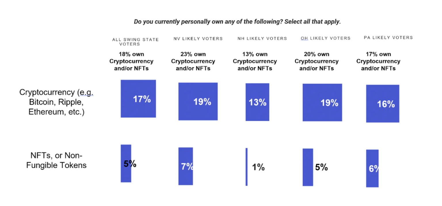 The poll showed that nearly one in five voters are owners of digital assets, and across these four swing states, these voters make up 18% of all voters.