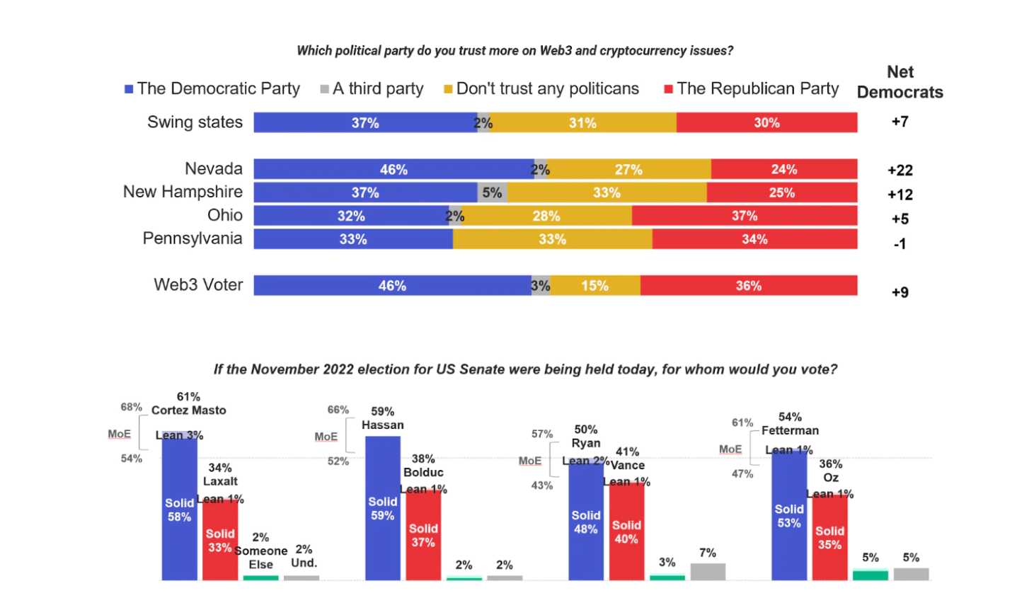 - The report further suggested that 55% of the voters are less likely to vote for web3 opposing candidates.