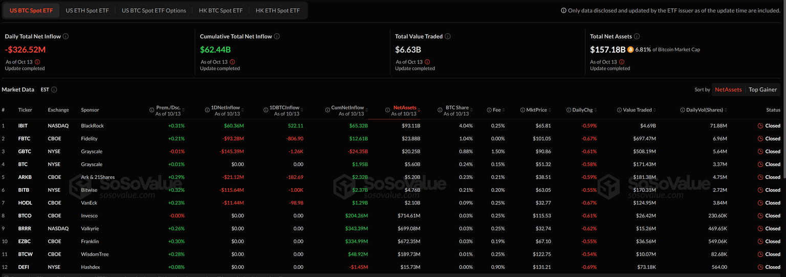 Bitcoin (BTC $110,832) ETFs recorded a net outflow of $326.52 million, according to SoSoValue data. Fidelity’s Wise Origin Bitcoin Fund (FBTC) saw the largest outflow at $93.28 million, while Grayscale’s Bitcoin Trust (GBTC) recorded a $145.39 million outflow.