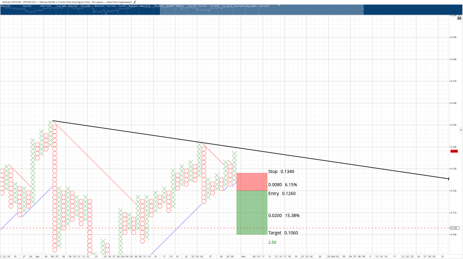 If buyers are unable or unwilling to push VeChain price above its near-term resistance, the sellers could come in and attempt to wrest control from buyers. If a new O-column develops and breaks a double-bottom at $0.128, then an extremely bearish Point and Figure pattern would be confirmed: the Bullish Fakeout. A theoretical short trade based on the Bullish Fakeout would be a sell stop at $0.126, stop loss at $0.134 and a profit target at $0.106.