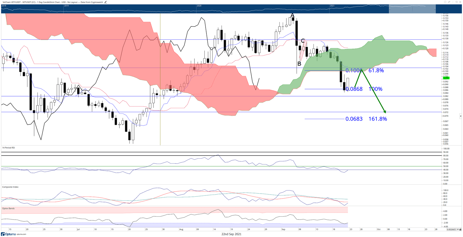 VeChain price has made some impressive downside moves since Monday, dropping over -25% to hit the bear’s target zone at $0.08. The resulting drop has placed VeChain into an inherently bearish position within the Ichimoku system by positioning the daily close below the Tenkan-Sen, Kijun-Sen and Cloud. However, the speed and size of the drop have created a significant gap between the close and the Tenkan-Sen.