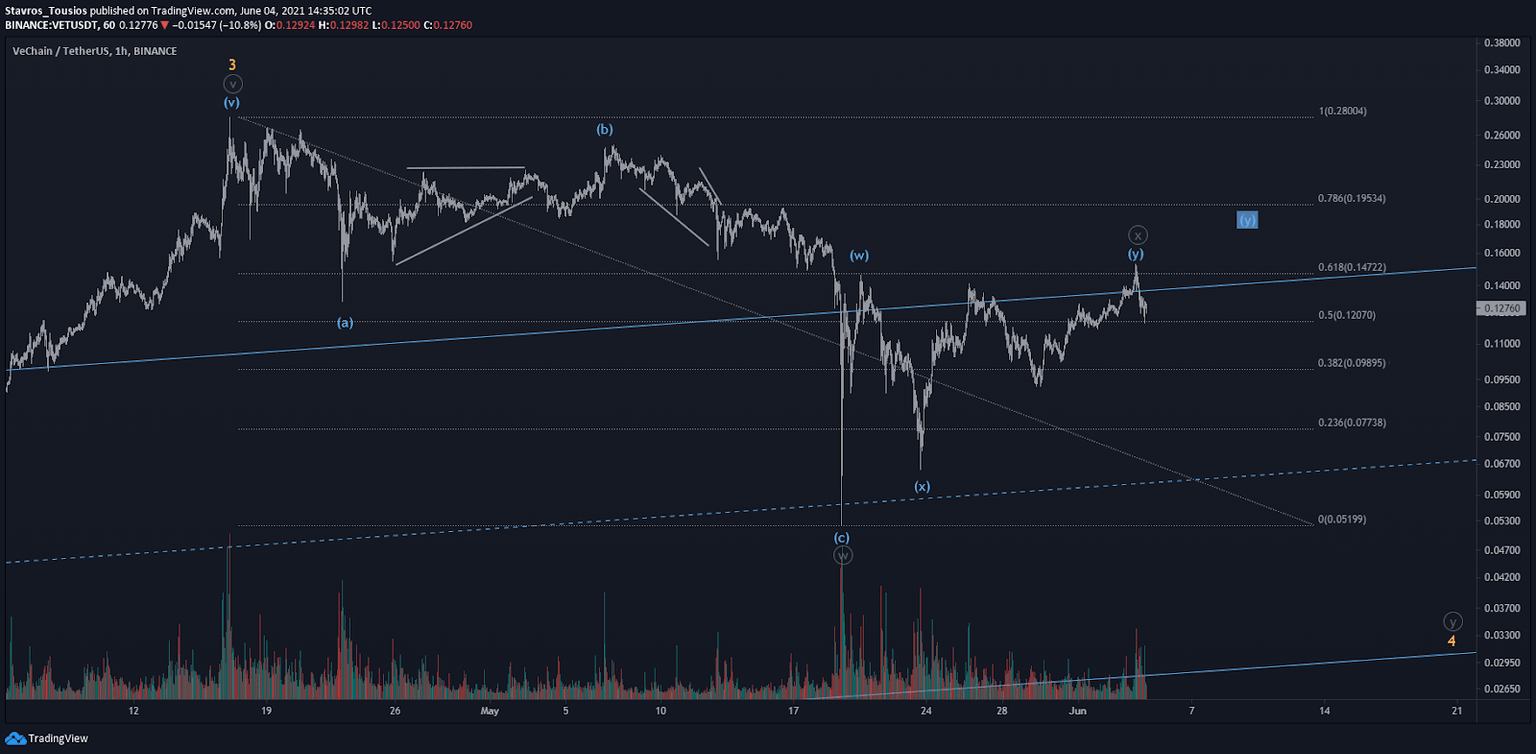 In my main scenario, I suggest that vechain has completed its correction in wave 4, where the medium regression of the base channel lays. The structure seen on the chart is an impulse wave to the upside, in both grey and blue degrees. However, the correction in blue wave (ii) seems incomplete.