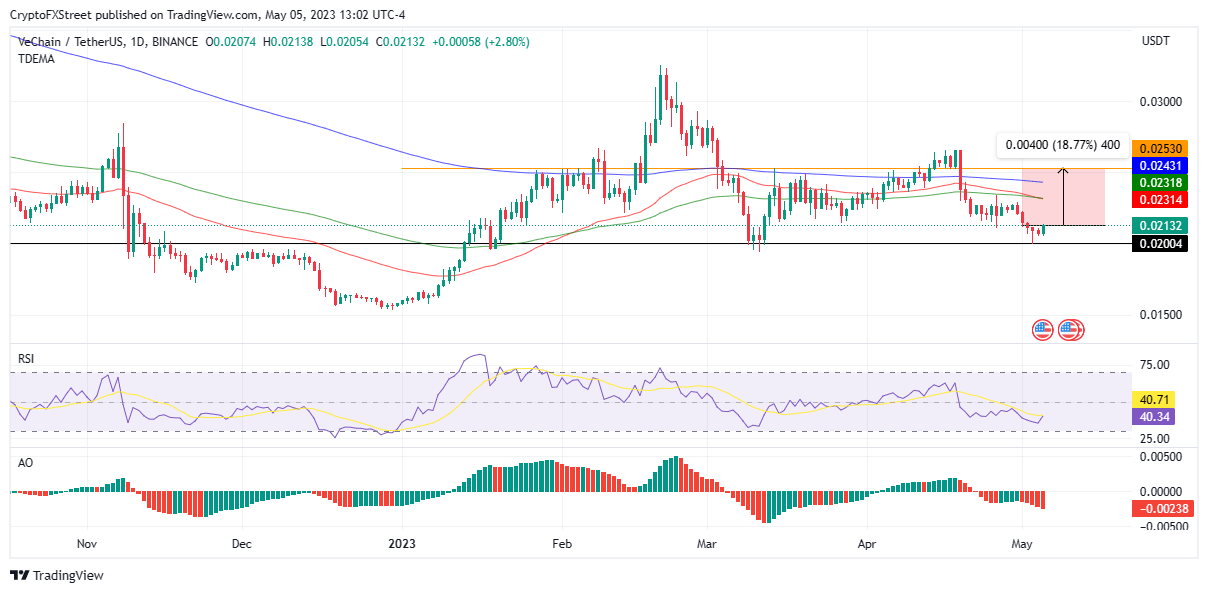 Further north, and with an influx of sidelined investors, VeChain price could extend a neck up to tag the 200-day EMA at $0.024 or, in a highly bullish case, tag the $0.025 resistance level. Such a move would constitute an 18.77% climb from the current level.