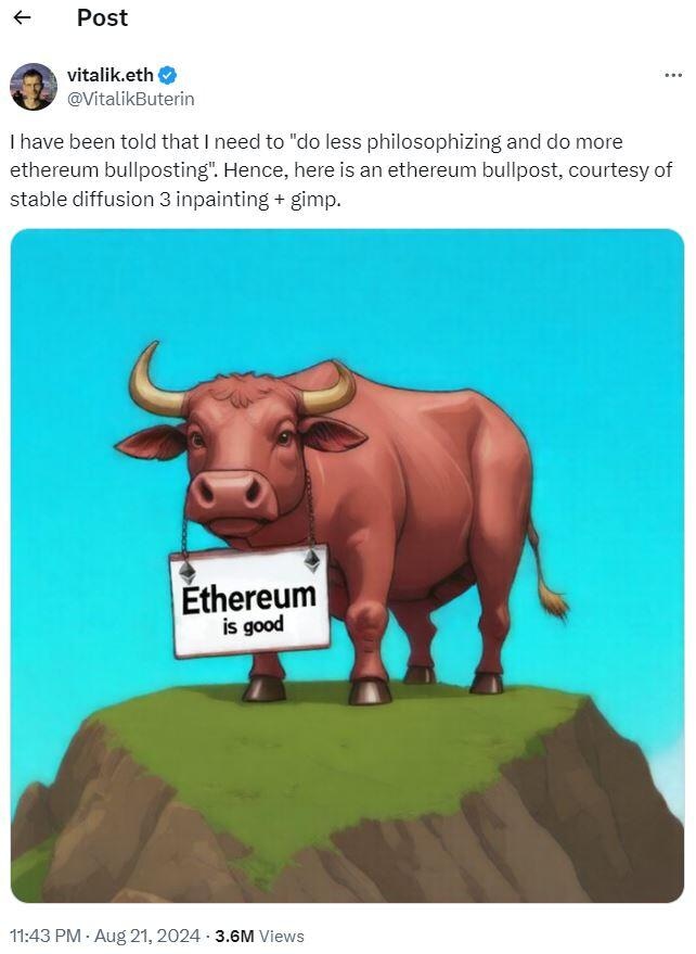 Buterin wrote in an Aug. 20 X post that he was told to "do less philosophizing and do more Ethereum bullposting.”