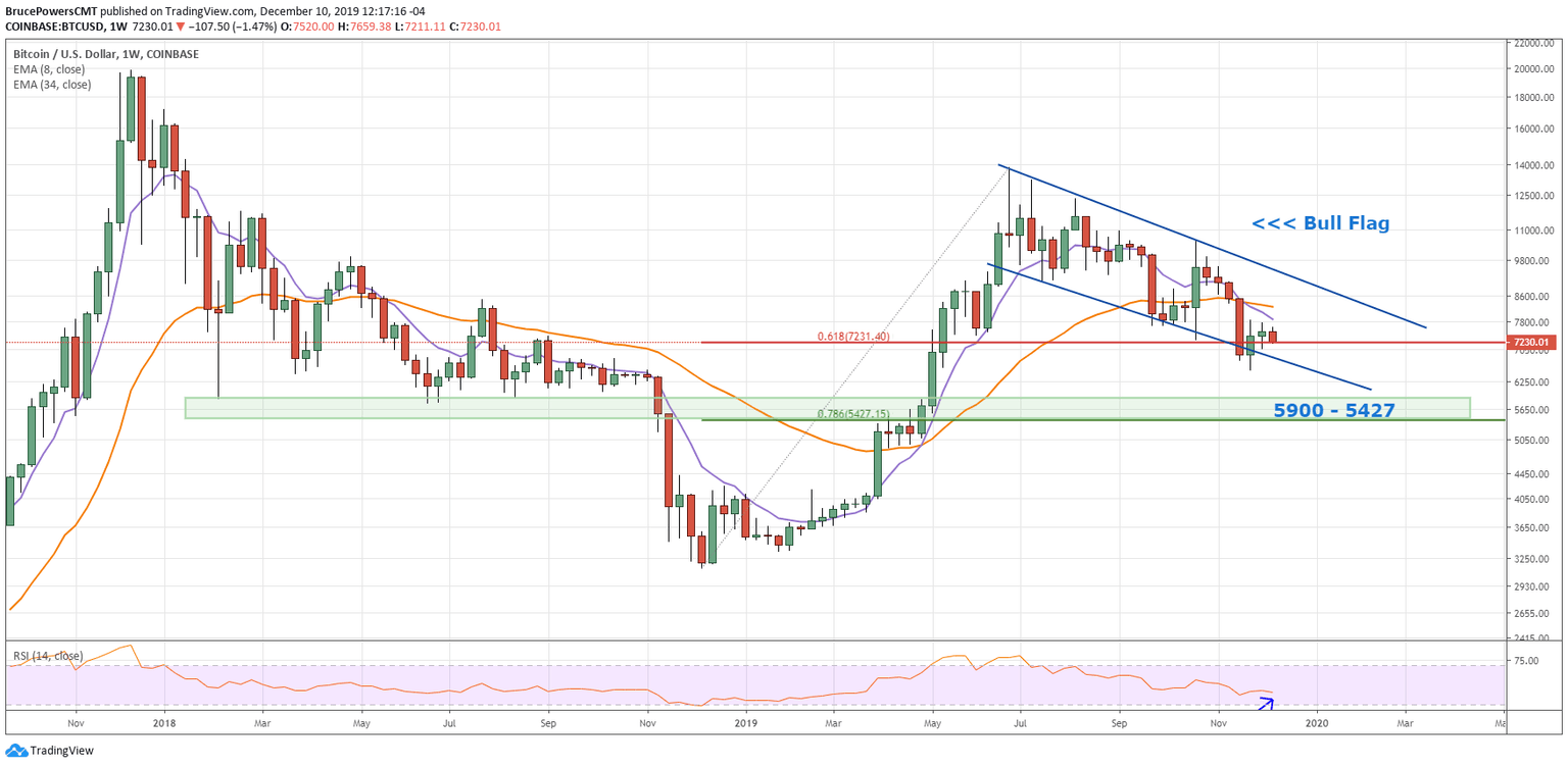 - Potential Bull Flag continues to form, with Bitcoin falling as much as 52.9% from its 2019 peak.