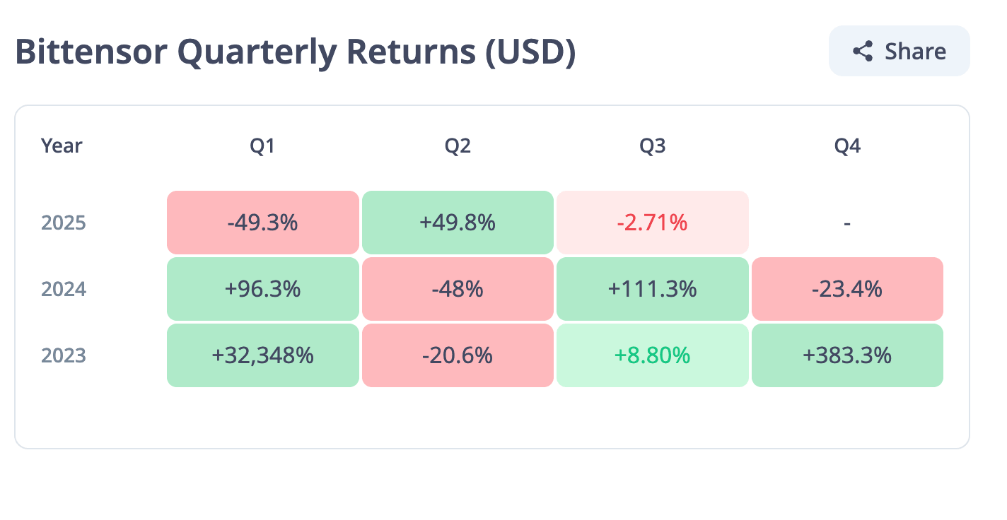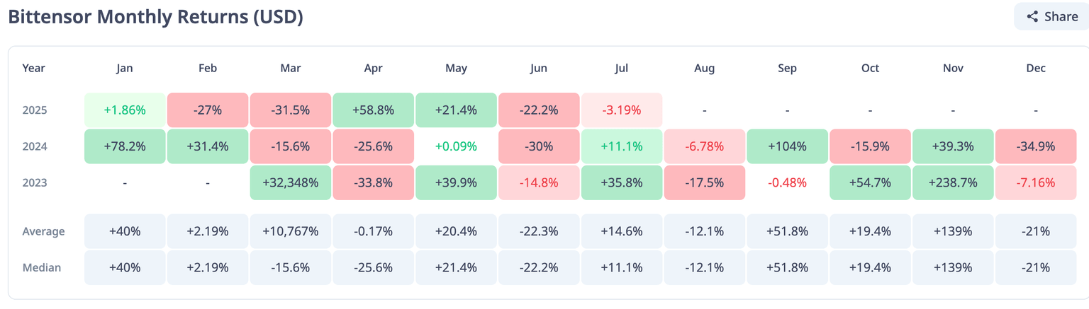 The slump in returns broke a two-month bullish streak, during which Bittensor’s returns averaged 59% in May and leveled slightly above 21% in June. As for quarterly returns, TAO pared losses in the second quarter with a 50% increase in price compared to a 49% decline in the first quarter.