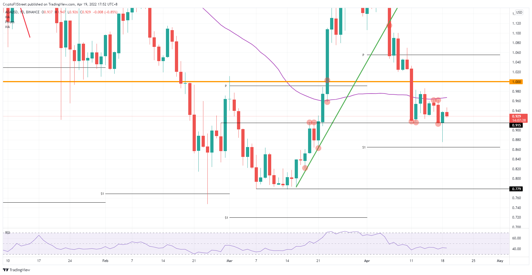 ADA price will soon drop back to the already-mentioned $0.9150, making it the fourth test and possibly even break further to the downside. Expect to see that drop look for support around the monthly S1 at $0.8650, with tail risks broadening and weighing on global investor sentiment, and a drop further towards $0.7790 also possibly on the cards. That level is a significant floor formed at the beginning of March and, by then, the RSI will be trading in ‘oversold’ and will see profit-taking among bears.