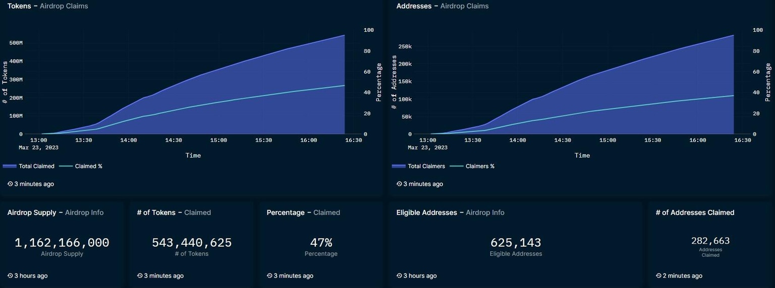 In the first 3-hours of the launch, over 47% of airdropped ARB has been claimed. This amounts to over 543 million tokens distributed to 282,663 wallets.