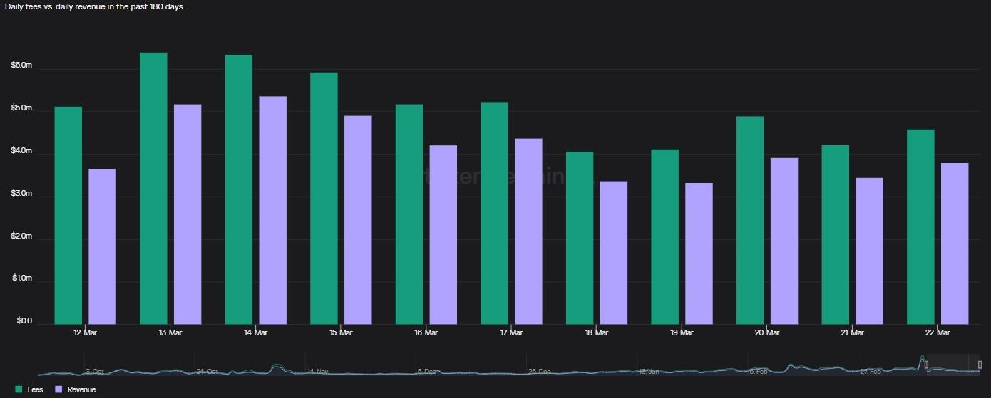 The Ethereum decentralized finance (DeFi) ecosystem received more daily fees, growing 9% in 24-hours on March 23 in tandem with Ether’s price growth. With the increase in Ether fees, the Ethereum proof of stake (PoS) token economics have turned deflationary and revenue is up 10% in the past 24-hours.