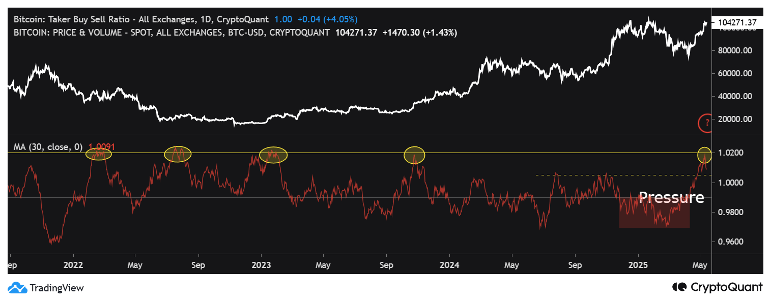Likewise, Bitcoin's spot Taker Buy/Sell Ratio across centralized exchanges has surged near the 1.02 level, according to data from CryptoQuant. The indicator, which tracks the ratio of aggressive buy-to-sell orders at market price, last hit such levels at the 2022 bottom near $15,000 and the breakout past $30,000 in late 2023, which were crucial turning points in the market.