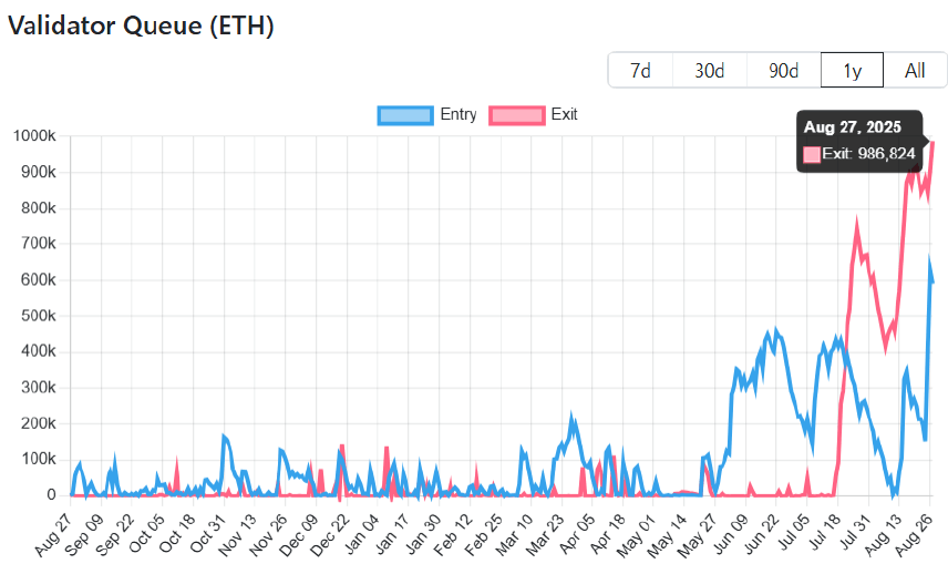 Validator Queue data adds more pressure. As of August 27, 2025, the ETH unstake queue reached a record 986,408 ETH, with a waiting time of 17 days and 3 hours. Such a backlog could trigger heavy selling in September.