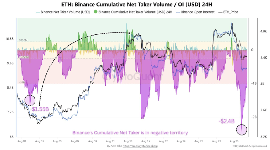 CryptoQuant data shows Ethereum’s Cumulative Net Taker Volume dropped below -$2.4 billion.