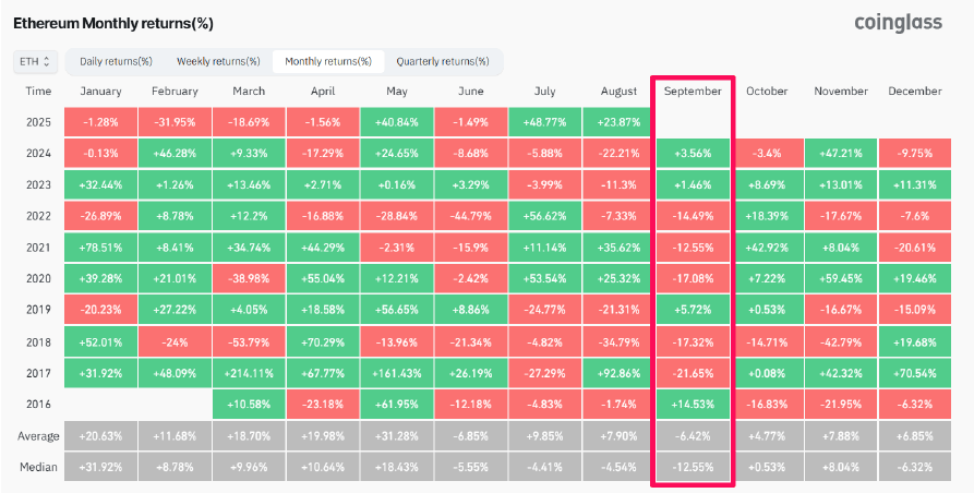 CoinGlass data on ETH’s monthly returns shows September has historically been weak. Since 2016, the average return has been -6.42% with a median of -12.55%.