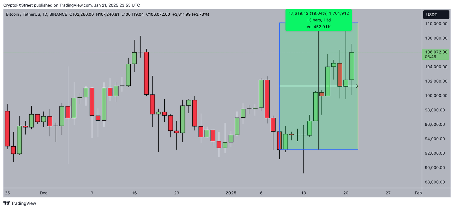 During that period, Bitcoin price also rose 19% from the lows recorded on January 9, to hit $109,241 on Monday before retracing to find support above the $100,000 territory.