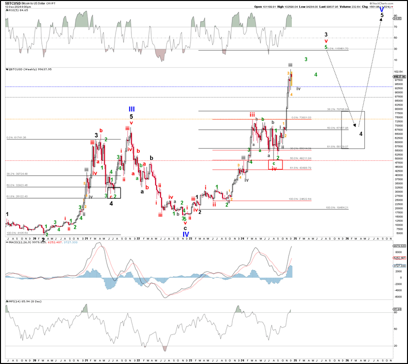 Hence, the orange W-3 and W-4 were completed, unfortunately just shy of the ideal target zone. Now, the question is whether the grey W-iii was completed at the recent all-time high of $104,028. Another down week this week will confirm this thesis as we assess down weeks as corrective. In that case, we can anticipate the grey W-iv to bottom out at, ideally, $90+/-2K before the next rally kicks in to ~$110K, completing the green W-3. One more down-up sequence should be expected to complete the green W-4 and W-5 sequences, respectively, at ideally $115+/-2K.