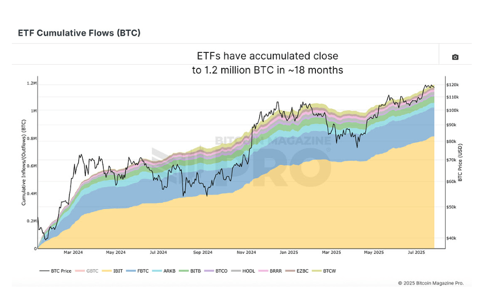 - Bitcoin spot ETFs accumulate over 1.2 million BTC in approximately 18 months, significantly reducing the circulating supply.