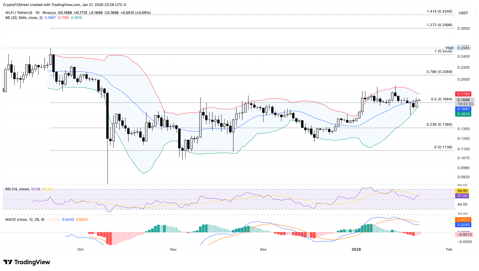 WLFI token trades near $0.1700 at press time on Thursday, rising above the 50% retracement level at $0.1664, measured from the September 21 and November 4 closing prices of $0.2436 and $0.1136, respectively.