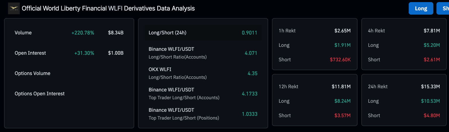 - WLFI Open Interest nears $1 billion, with volume exceeding $8 billion, as investor sentiment skyrockets.