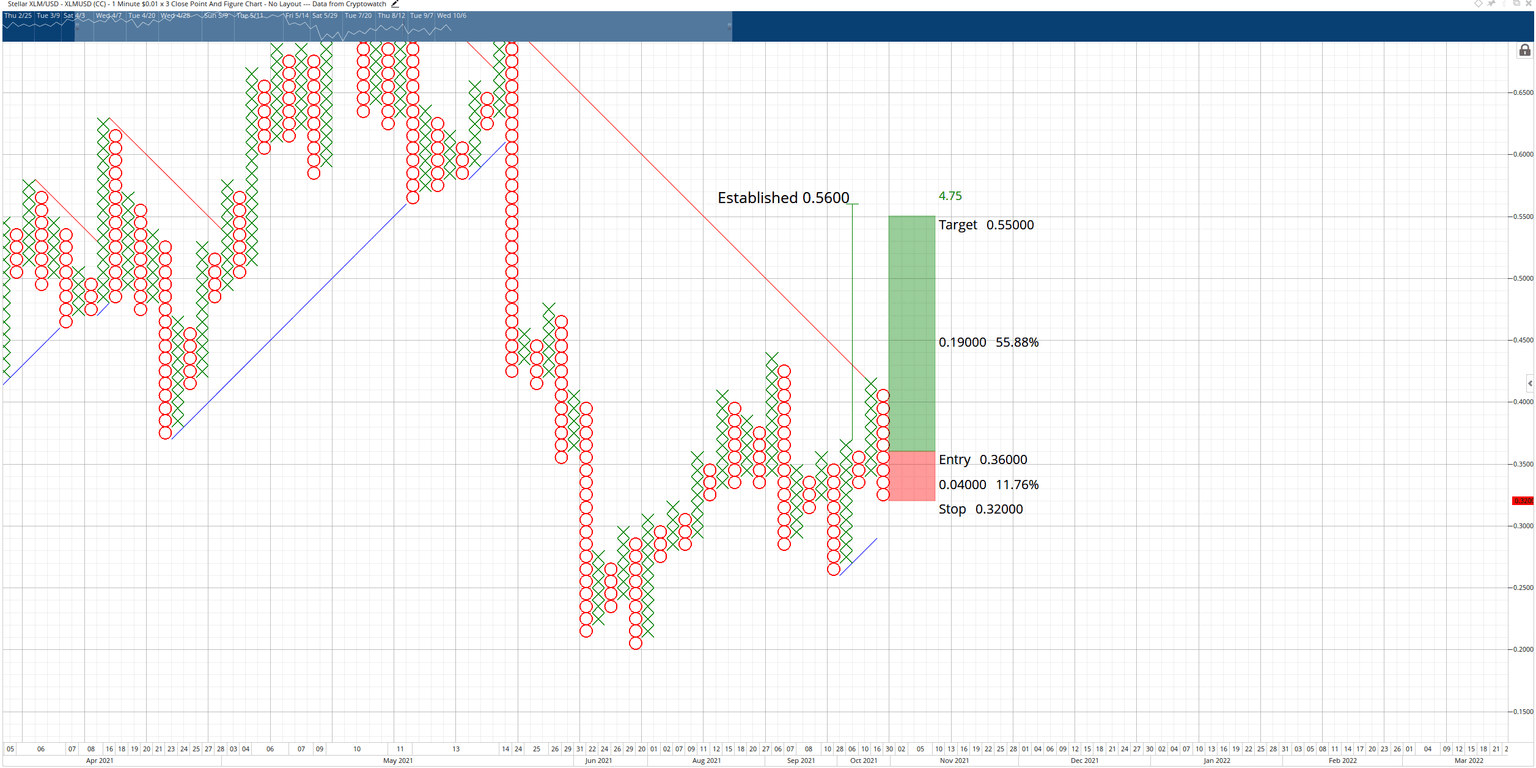 Because XLM price broke the bear trend angle, the market has converted into a bull market. The hypothetical long trade setup is a buy stop at the 3-box reversal ($0.36 at the time of publishing) with a 4-box stop loss and an optional 3-box trailing stop. The projected profit target from that entry is $0.55.