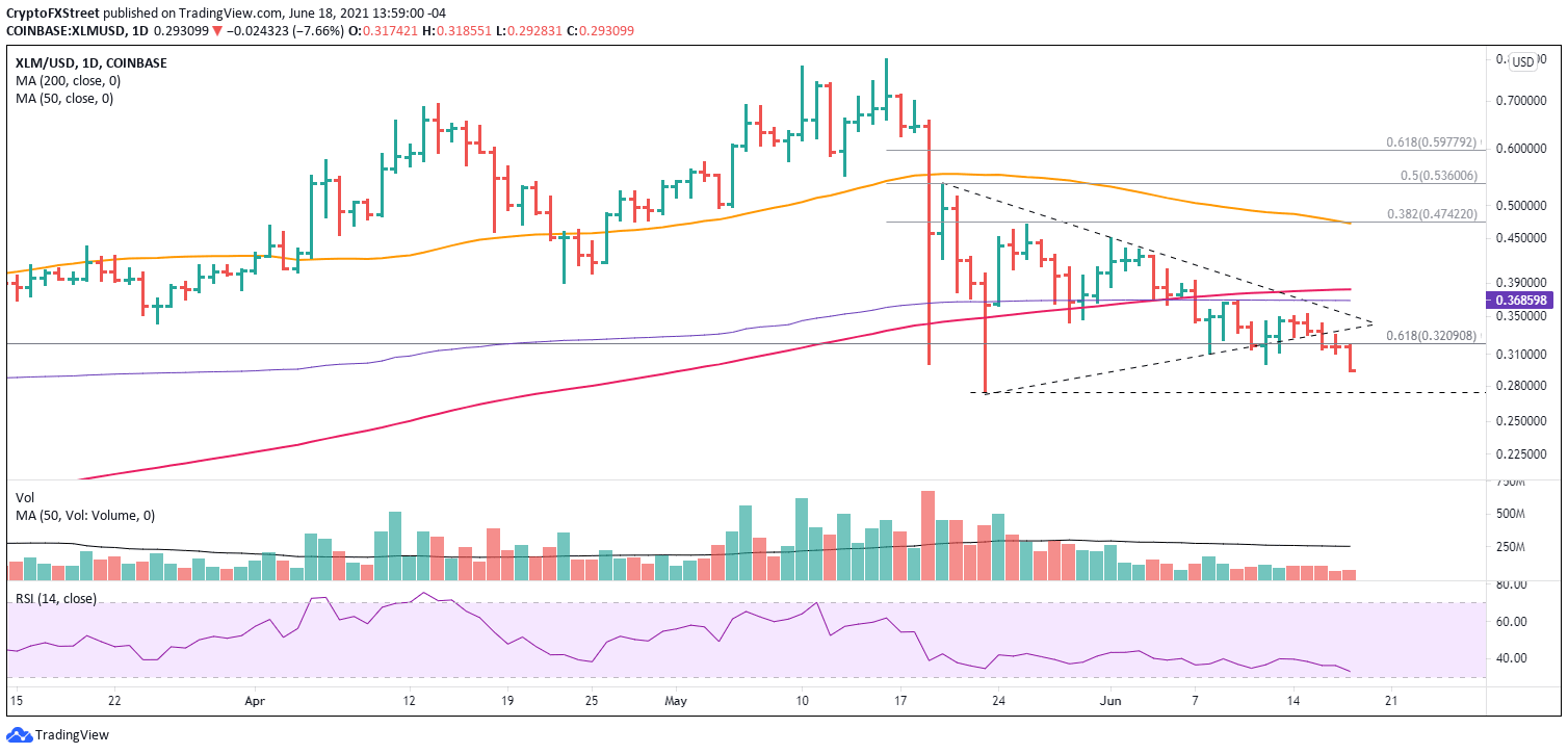 - Stellar 61.8% Fibonacci retracement level fails to halt breakdown, unleashing the digital asset to test the May 23 low.