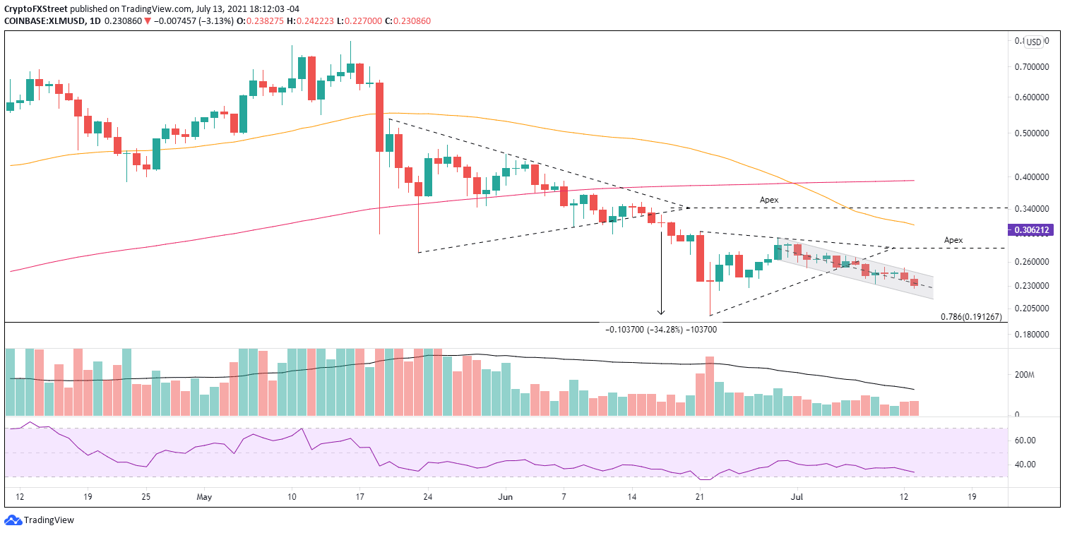 As stated, the long-term XLM price outlook remains negative, with the symmetrical triangle pattern projecting a decline of 34% from the breakout and a final low of $0.171. It would wipe out most of the 2021 gains for Stellar and bust the support attached to the June 22 low of $0.198 and the 78.6% Fibonacci retracement level of the March 2020-May 2021 advance at $0.191.