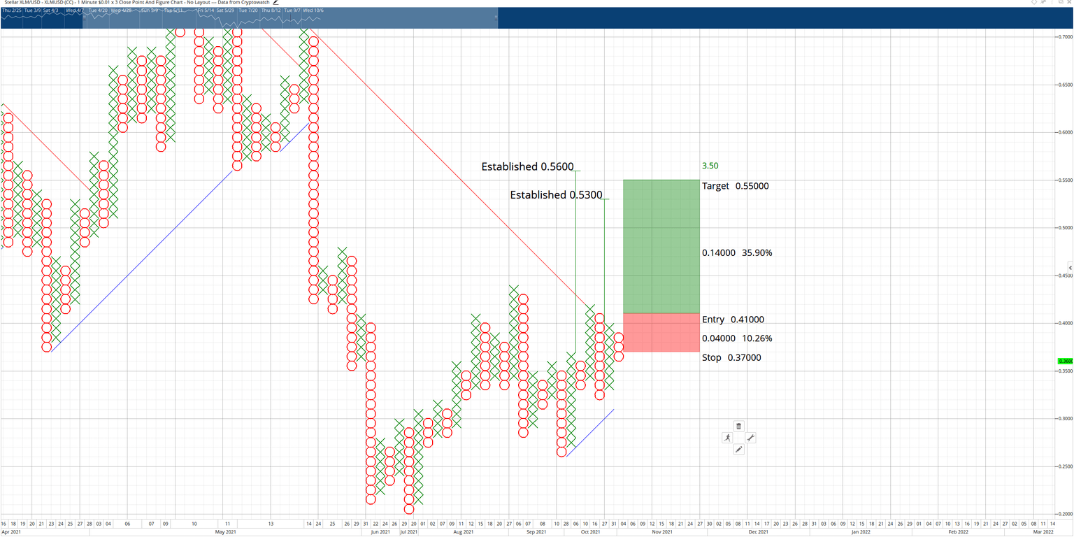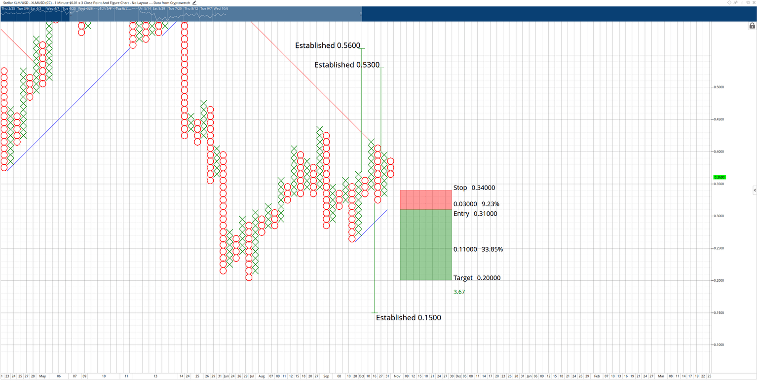 The short side of the trade is a little tricker and requires more active management of the trade. If the current column of Os dropped to a double bottom at $0.32, XLM price might find support at a high volume node in the volume profile and the dominant bull market angle (blue diagonal line). Therefore, developing a triple-bottom or a split triple-bottom at $0.32 would be necessary for a hypothetical short entry at $0.31. The short entry idea is a sell stop at $0.31, a stop loss at $0.34 and a profit target at $0.20 – again, only if there is a triple-bottom or split-triple bottom.