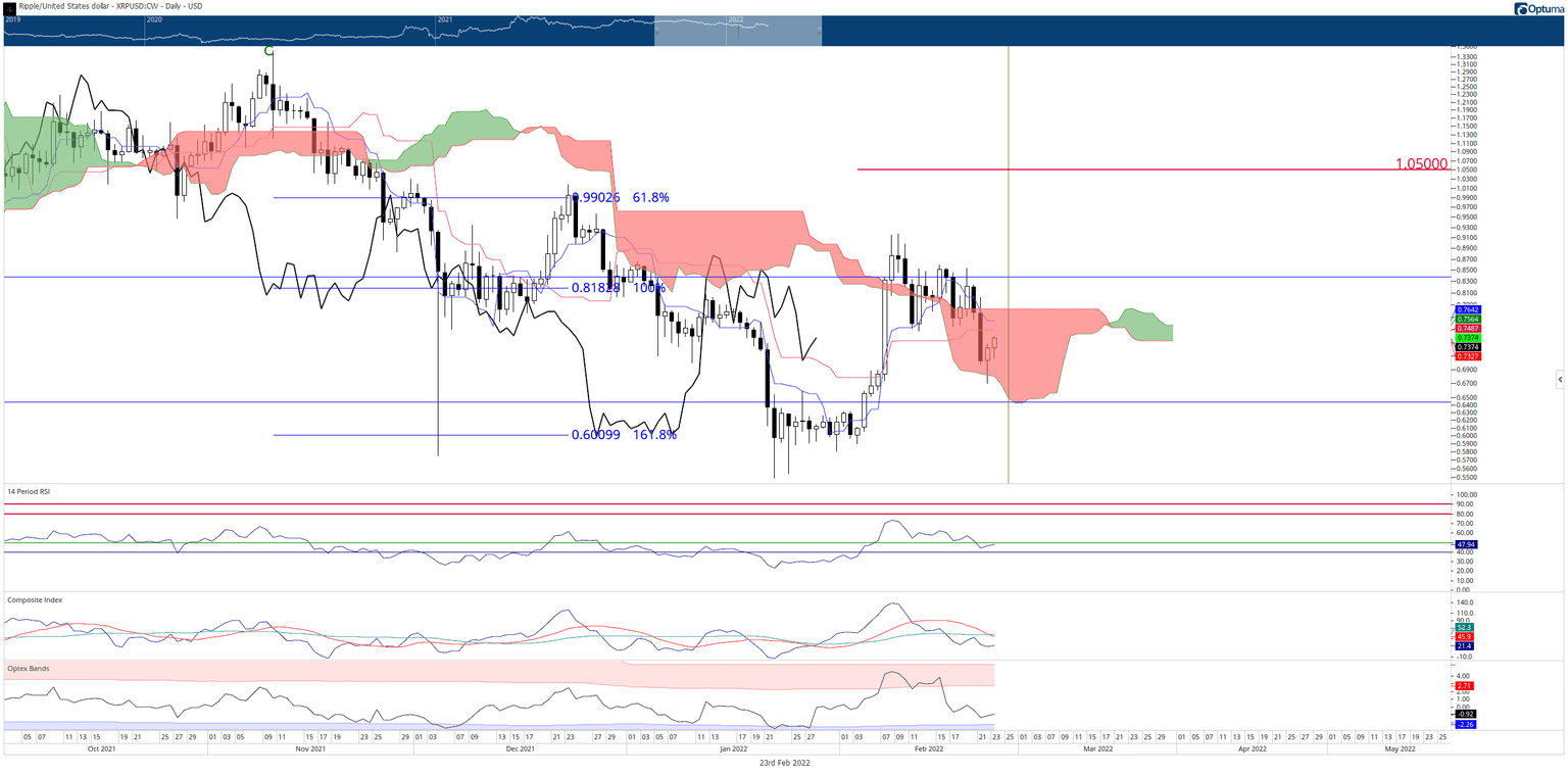 XRP price is approaching a make or break point for buyers. The recent fall below the top of the Cloud (Senkou Span B), the Tenkan-Sen, and Kijun-Sen has resulted in those levels acting as the primary resistance cluster on the daily chart. While the rally is impressive and no doubt bullish – it could quickly be terminated if bulls fail to crack above those three Ichimoku levels in the $0.750 to $0.785 value area.