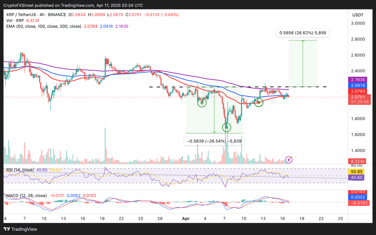 XRP price stalled in the quest to break a confluence resistance highlighted in a previous analysis at $2.25, resulting in a sudden pullback that tested the critical $2.00 support level on Wednesday. Although the crypto market has shown resilience amid the extended tariffs and trade wars launched by US President Donald Trump, including a 245% tariff on China, investors are jittery about the short-term and long-term economic outlook. XRP faces a significant decline in bullish momentum.