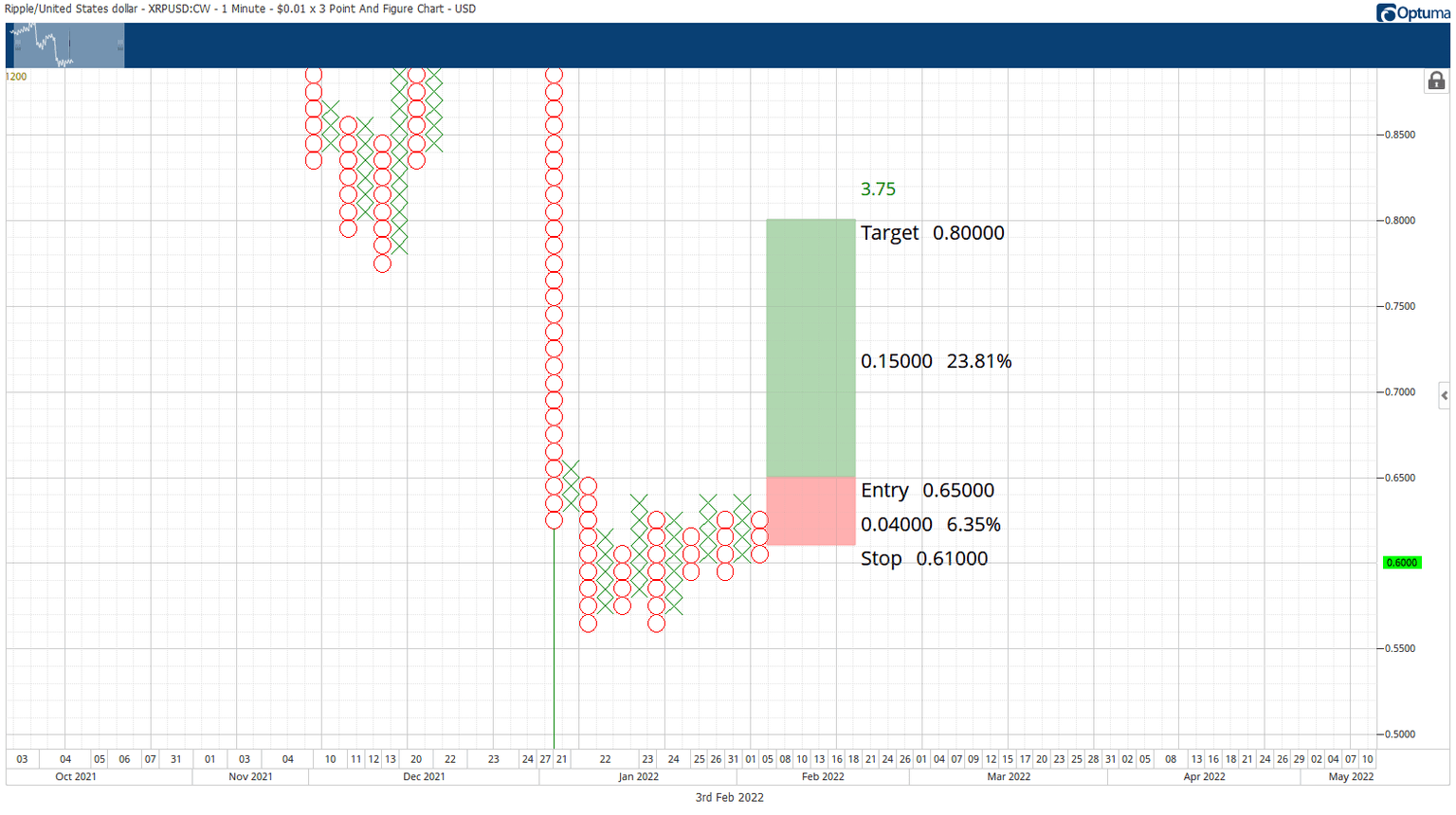 The long entry represents a 3.75:1 reward/risk with an implied profit target of nearly 24% from the entry. Because trades rarely reach their full profit target potential, a two to three-box trailing stop would help protect any implied profit. The trade is invalidated if the current O-column moves to $0.57.