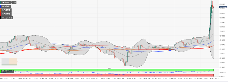 The RSI (Relative Strength Index) on the 1-hour chart is deep on the overbought territory, which means that the coin is vulnerable to a technical correction. The initial support is created by psychological $0.2000 reinforced by the middle line of 1-hour Bollinger Band. If it gives way, the sell-off may be extended towards $0.1930 ( the middle line of the daily Bollinger Band) and psychological $0.1900.