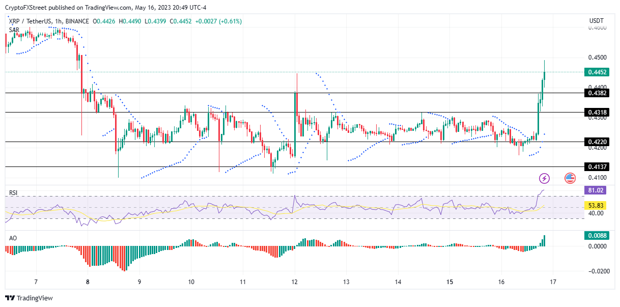If investors sustain the bullish momentum, Ripple price could scale higher past the current market value of $0.445 to shatter the psychological $0.450 hurdle and reclaim the early May highs.